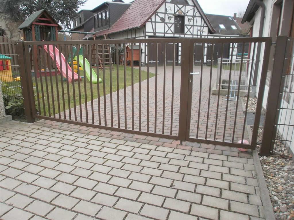 Toranlagen sind entsprechend der jeweiligen Zaunhöhe lieferbar. Die Breite wird in individuellen Abmessungen gefertigt. Ein-, zwei- oder auch 3-flügelige Tore sind erhältlich.
